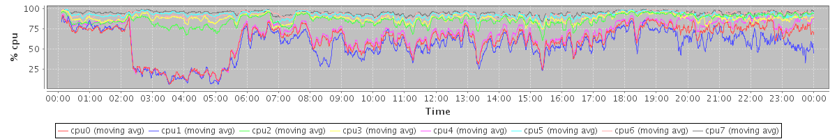 avg(cpu0) = 14.98 avg(cpu1) = 15.85 avg(cpu2) = 8.72 avg(cpu3) = 8.36 avg(cpu4) = 9.43 avg(cpu5) = 5.65 avg(cpu6) = 5.21 avg(cpu7) = 3.95