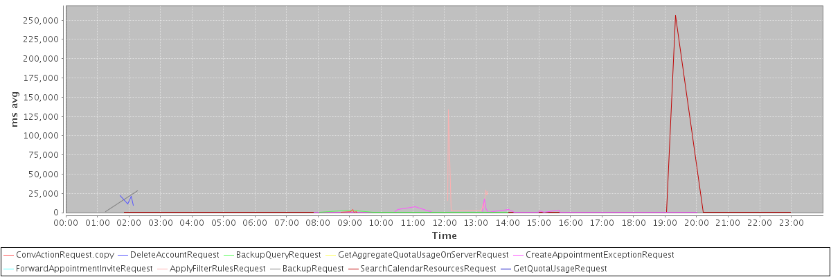 avg(ConvActionRequest.copy) = 1346.67 avg(DeleteAccountRequest) = 15936.75 avg(BackupQueryRequest) = 983.60 avg(GetAggregateQuotaUsageOnServerRequest) = 3085.00 avg(CreateAppointmentExceptionRequest) = 1427.20 avg(ForwardAppointmentInviteRequest) = 1631.00 avg(ApplyFilterRulesRequest) = 19458.93 avg(BackupRequest) = 14622.00 avg(SearchCalendarResourcesRequest) = 1140.26 avg(GetQuotaUsageRequest) = 3892.00