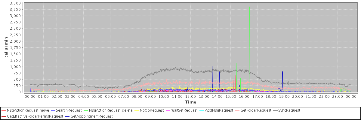 max(MsgActionRequest.move) = 671.00 max(SearchRequest) = 175.00 max(MsgActionRequest.delete) = 3357.00 max(NoOpRequest) = 245.00 max(WaitSetRequest) = 110.00 max(AddMsgRequest) = 196.00 max(GetFolderRequest) = 501.00 max(SyncRequest) = 971.00 max(GetEffectiveFolderPermsRequest) = 157.00 max(GetAppointmentRequest) = 1012.00