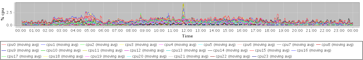avg(cpu0) = 0.12 avg(cpu1) = 0.10 avg(cpu2) = 0.05 avg(cpu3) = 0.07 avg(cpu4) = 0.02 avg(cpu5) = 0.02 avg(cpu6) = 0.01 avg(cpu7) = 0.01 avg(cpu8) = 0.01 avg(cpu9) = 0.00 avg(cpu10) = 0.00 avg(cpu11) = 0.03 avg(cpu12) = 0.02 avg(cpu13) = 0.01 avg(cpu14) = 0.04 avg(cpu15) = 0.04 avg(cpu16) = 0.03 avg(cpu17) = 0.03 avg(cpu18) = 0.05 avg(cpu19) = 0.03 avg(cpu20) = 0.03 avg(cpu21) = 0.00 avg(cpu22) = 0.00 avg(cpu23) = 0.00