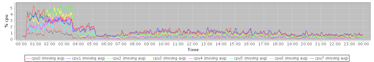 avg(cpu0) = 0.18 avg(cpu1) = 0.16 avg(cpu2) = 0.05 avg(cpu3) = 0.06 avg(cpu4) = 0.04 avg(cpu5) = 0.04 avg(cpu6) = 0.02 avg(cpu7) = 0.02