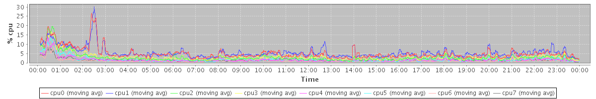 avg(cpu0) = 11.31 avg(cpu1) = 14.95 avg(cpu2) = 0.61 avg(cpu3) = 0.41 avg(cpu4) = 0.21 avg(cpu5) = 0.20 avg(cpu6) = 0.03 avg(cpu7) = 0.12