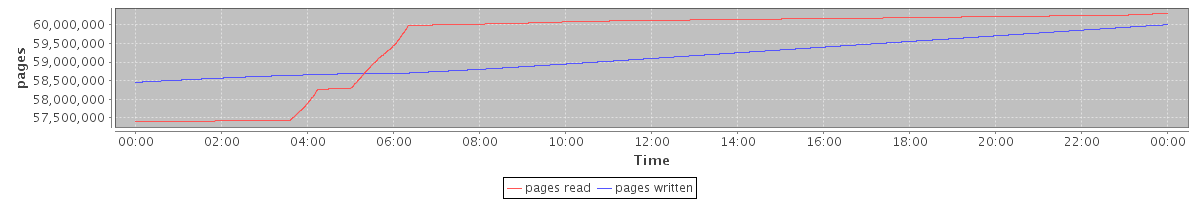 avg(pages read) = 59558247.67 avg(pages written) = 59146455.76