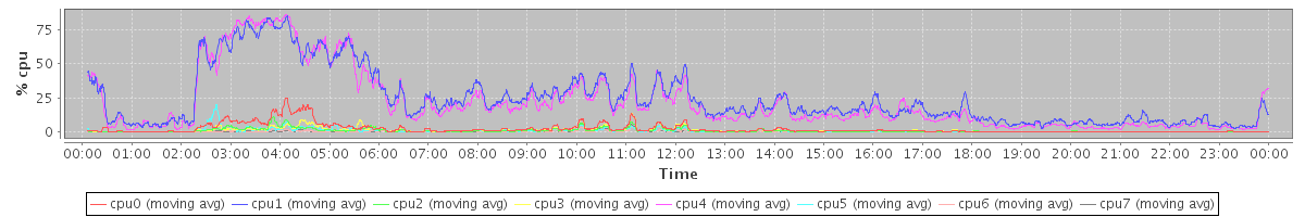 avg(cpu0) = 2.18 avg(cpu1) = 24.05 avg(cpu2) = 0.91 avg(cpu3) = 1.21 avg(cpu4) = 21.46 avg(cpu5) = 0.87 avg(cpu6) = 0.26 avg(cpu7) = 0.32