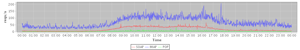 Host zm04.stanford.edu: Mailboxd: Request Rate by Client Protocol
