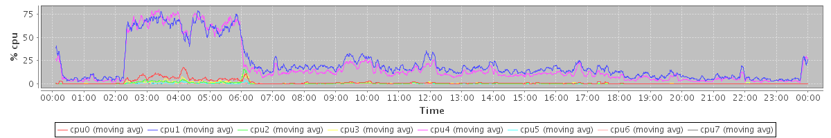 avg(cpu0) = 1.51 avg(cpu1) = 21.64 avg(cpu2) = 0.58 avg(cpu3) = 0.83 avg(cpu4) = 18.59 avg(cpu5) = 0.33 avg(cpu6) = 0.13 avg(cpu7) = 0.13