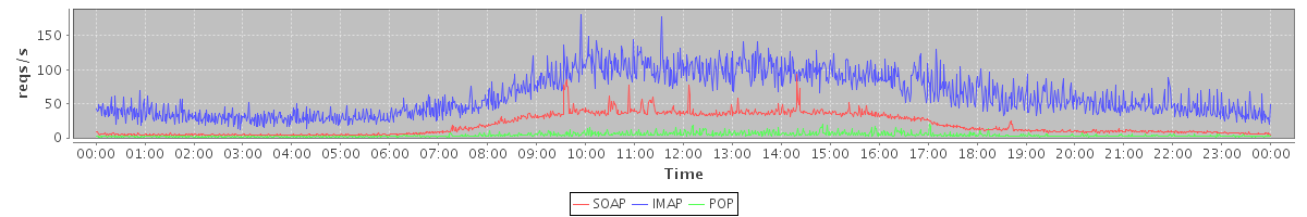 Host zm04.stanford.edu: Mailboxd: Request Rate by Client Protocol