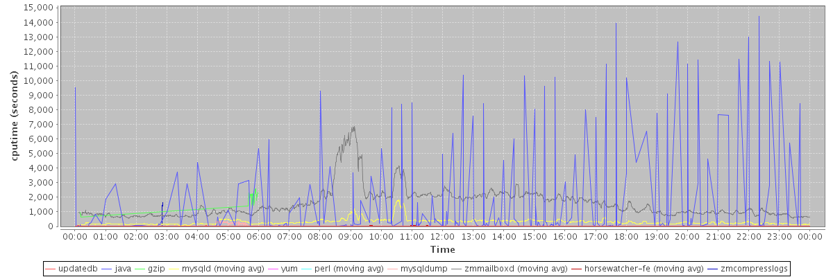 avg(updatedb) = 26.38 avg(java) = 1420.54 avg(gzip) = 1955.98 avg(mysqld) = 311.09 avg(yum) = 36.00 avg(perl) = 20.06 avg(mysqldump) = 230.04 avg(zmmailboxd) = 1559.12 avg(horsewatcher-fe) = 23.04 avg(zmcompresslogs) = 1185.80