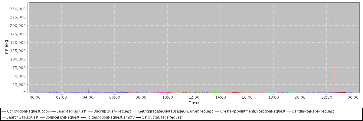 avg(ConvActionRequest.copy) = 371.40 avg(SendMsgRequest) = 511.67 avg(BackupQueryRequest) = 402.57 avg(GetAggregateQuotaUsageOnServerRequest) = 1270.00 avg(CreateAppointmentExceptionRequest) = 349.10 avg(SendInviteReplyRequest) = 551.90 avg(SearchGalRequest) = 423.78 avg(BounceMsgRequest) = 1738.00 avg(FolderActionRequest.empty) = 442.88 avg(GetQuotaUsageRequest) = 1560.00