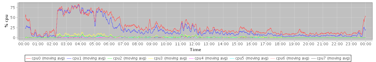 avg(cpu0) = 26.53 avg(cpu1) = 19.44 avg(cpu2) = 1.44 avg(cpu3) = 1.89 avg(cpu4) = 0.71 avg(cpu5) = 0.67 avg(cpu6) = 0.51 avg(cpu7) = 0.29