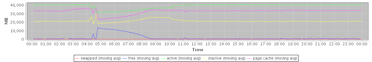 avg(swapped) = 1.12 avg(free) = 1949.88 avg(active) = 39053.75 avg(inactive) = 21605.52 avg(page cache) = 32842.96