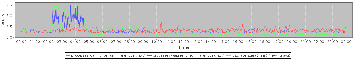 avg(processes waiting for run time) = 0.86 avg(processes waiting for io time) = 0.64 avg(load average (1 min)) = 1.41