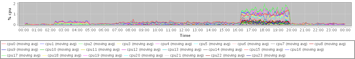 avg(cpu0) = 1.62 avg(cpu1) = 1.50 avg(cpu2) = 1.45 avg(cpu3) = 1.31 avg(cpu4) = 1.18 avg(cpu5) = 0.87 avg(cpu6) = 0.64 avg(cpu7) = 0.53 avg(cpu8) = 0.48 avg(cpu9) = 0.36 avg(cpu10) = 0.36 avg(cpu11) = 0.27 avg(cpu12) = 0.64 avg(cpu13) = 0.48 avg(cpu14) = 0.94 avg(cpu15) = 1.01 avg(cpu16) = 0.65 avg(cpu17) = 0.67 avg(cpu18) = 0.55 avg(cpu19) = 0.56 avg(cpu20) = 0.46 avg(cpu21) = 0.26 avg(cpu22) = 0.19 avg(cpu23) = 0.20