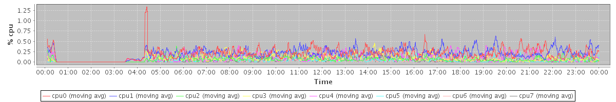 avg(cpu0) = 1.37 avg(cpu1) = 1.24 avg(cpu2) = 0.81 avg(cpu3) = 0.77 avg(cpu4) = 1.08 avg(cpu5) = 0.51 avg(cpu6) = 0.48 avg(cpu7) = 0.34