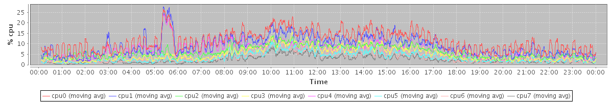 avg(cpu0) = 11.19 avg(cpu1) = 8.97 avg(cpu2) = 6.20 avg(cpu3) = 5.14 avg(cpu4) = 6.91 avg(cpu5) = 3.55 avg(cpu6) = 3.72 avg(cpu7) = 2.50