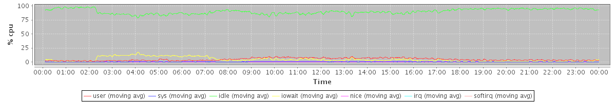 avg(user) = 4.62 avg(sys) = 0.53 avg(idle) = 90.15 avg(iowait) = 4.53 avg(nice) = 0.11 avg(irq) = 0.00 avg(softirq) = 0.06
