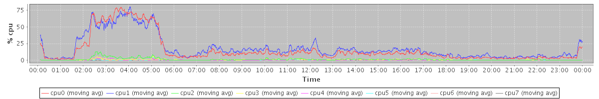 avg(cpu0) = 15.34 avg(cpu1) = 18.14 avg(cpu2) = 1.27 avg(cpu3) = 0.78 avg(cpu4) = 0.44 avg(cpu5) = 0.41 avg(cpu6) = 0.22 avg(cpu7) = 0.22