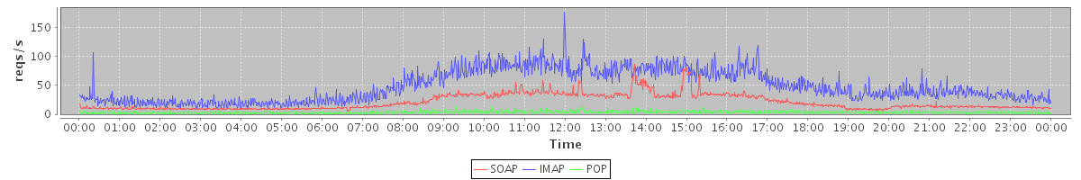 Host zm02.stanford.edu: Mailboxd: Request Rate by Client Protocol