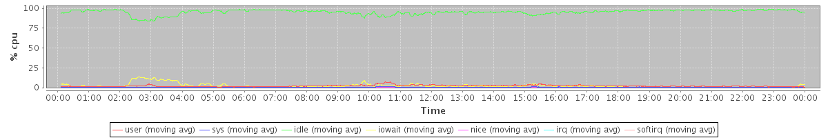 avg(user) = 2.08 avg(sys) = 0.37 avg(idle) = 95.25 avg(iowait) = 2.17 avg(nice) = 0.11 avg(irq) = 0.00 avg(softirq) = 0.02