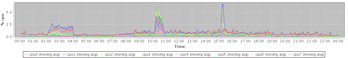 avg(cpu0) = 15.89 avg(cpu1) = 11.43 avg(cpu2) = 0.49 avg(cpu3) = 1.06 avg(cpu4) = 0.24 avg(cpu5) = 0.48 avg(cpu6) = 0.20 avg(cpu7) = 0.24