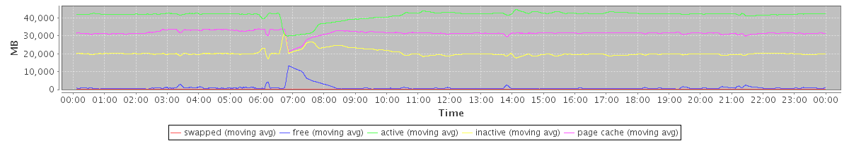 avg(swapped) = 41.15 avg(free) = 1133.07 avg(active) = 41423.77 avg(inactive) = 20263.82 avg(page cache) = 31489.44