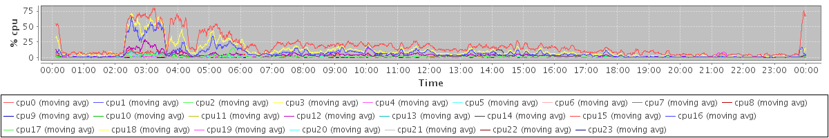 avg(cpu0) = 18.73 avg(cpu1) = 7.79 avg(cpu2) = 1.11 avg(cpu3) = 11.42 avg(cpu4) = 0.68 avg(cpu5) = 0.69 avg(cpu6) = 0.29 avg(cpu7) = 0.30 avg(cpu8) = 0.16 avg(cpu9) = 0.06 avg(cpu10) = 0.16 avg(cpu11) = 0.03 avg(cpu12) = 3.34 avg(cpu13) = 0.81 avg(cpu14) = 0.77 avg(cpu15) = 1.60 avg(cpu16) = 0.41 avg(cpu17) = 0.50 avg(cpu18) = 0.38 avg(cpu19) = 0.60 avg(cpu20) = 0.38 avg(cpu21) = 0.01 avg(cpu22) = 0.03 avg(cpu23) = 0.01