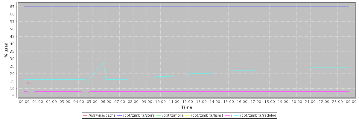 avg(/usr/vice/cache) = 13.01 avg(/opt/zimbra/store) = 65.00 avg(/opt/zimbra) = 54.00 avg(/opt/zimbra/hsm1) = 64.00 avg(/) = 7.96 avg(/opt/zimbra/redolog) = 19.80