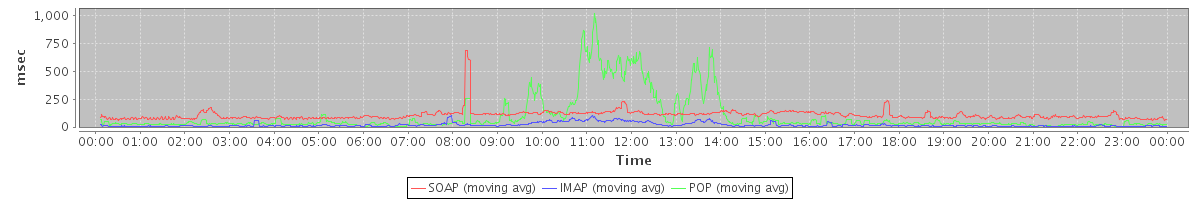avg(SendMsgRequest) = 541.32 avg(DeleteAccountRequest) = 38443.00 avg(BackupQueryRequest) = 431.86 avg(GetAggregateQuotaUsageOnServerRequest) = 2573.00 avg(SendInviteReplyRequest) = 495.44 avg(RemoveAttachmentsRequest) = 2671.00 avg(ApplyFilterRulesRequest) = 36115.00 avg(FolderActionRequest.empty) = 1228.85 avg(SendShareNotificationRequest) = 437.50 avg(GetQuotaUsageRequest) = 3254.00