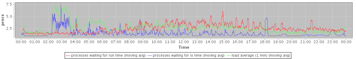 avg(processes waiting for run time) = 2.54 avg(processes waiting for io time) = 0.75 avg(load average (1 min)) = 2.73