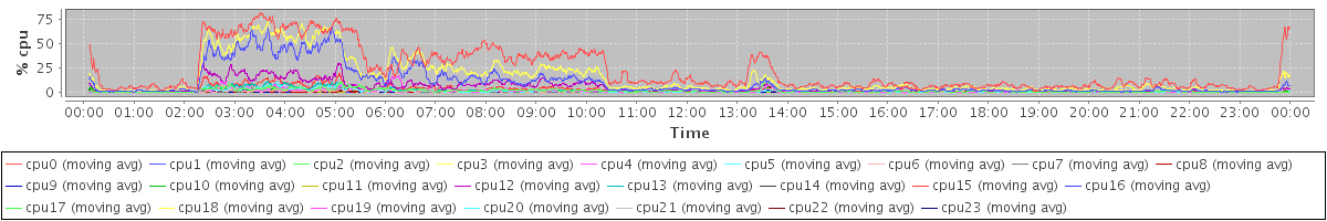 avg(cpu0) = 0.18 avg(cpu1) = 0.13 avg(cpu2) = 0.11 avg(cpu3) = 0.09 avg(cpu4) = 0.06 avg(cpu5) = 0.04 avg(cpu6) = 0.04 avg(cpu7) = 0.04 avg(cpu8) = 0.04 avg(cpu9) = 0.03 avg(cpu10) = 0.05 avg(cpu11) = 0.03 avg(cpu12) = 0.05 avg(cpu13) = 0.02 avg(cpu14) = 0.05 avg(cpu15) = 0.05 avg(cpu16) = 0.47 avg(cpu17) = 0.28 avg(cpu18) = 0.23 avg(cpu19) = 0.18 avg(cpu20) = 0.11 avg(cpu21) = 0.09 avg(cpu22) = 0.06 avg(cpu23) = 0.04