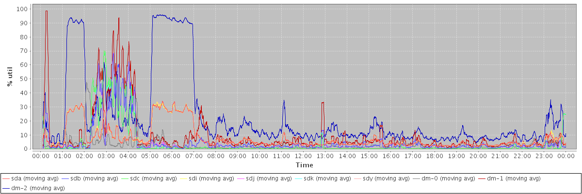 avg(sda) = 7.66 avg(sdb) = 5.19 avg(sdc) = 3.98 avg(sdi) = 7.67 avg(sdj) = 5.18 avg(sdk) = 3.95 avg(sdy) = 7.69 avg(dm-0) = 2.95 avg(dm-1) = 9.41 avg(dm-2) = 22.72