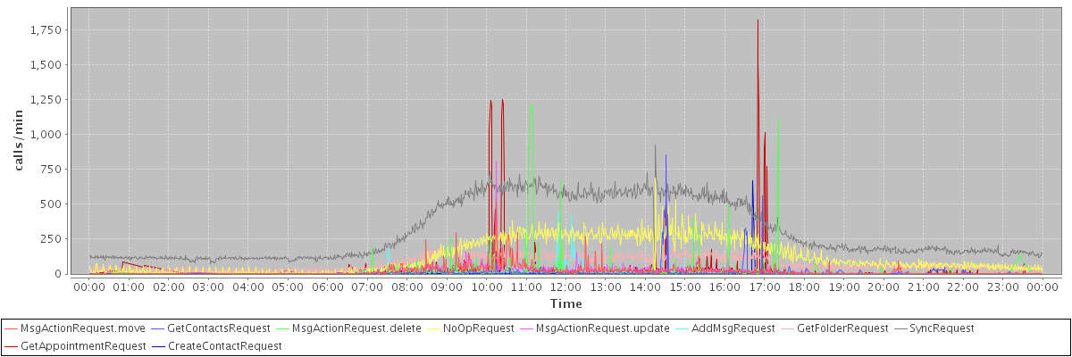 max(MsgActionRequest.move) = 533.00 max(GetContactsRequest) = 853.00 max(MsgActionRequest.delete) = 1212.00 max(NoOpRequest) = 688.00 max(MsgActionRequest.update) = 806.00 max(AddMsgRequest) = 442.00 max(GetFolderRequest) = 248.00 max(SyncRequest) = 925.00 max(GetAppointmentRequest) = 1820.00 max(CreateContactRequest) = 670.00