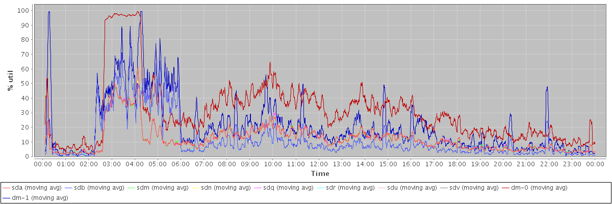 avg(sda) = 12.24 avg(sdb) = 11.65 avg(sdm) = 12.23 avg(sdn) = 11.66 avg(sdq) = 12.22 avg(sdr) = 11.66 avg(sdu) = 12.21 avg(sdv) = 11.66 avg(dm-0) = 30.87 avg(dm-1) = 20.87
