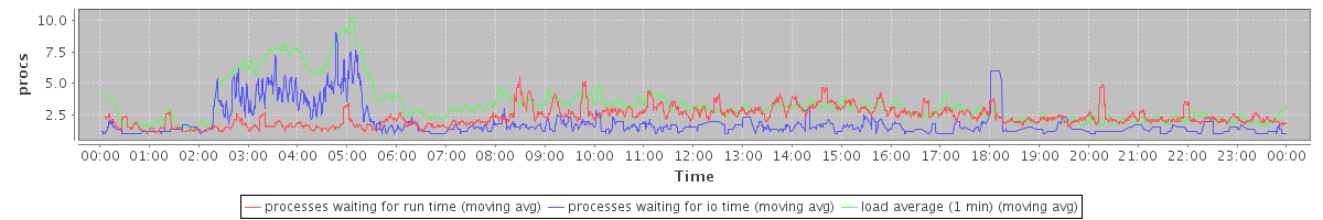 avg(processes waiting for run time) = 2.34 avg(processes waiting for io time) = 1.04 avg(load average (1 min)) = 3.35