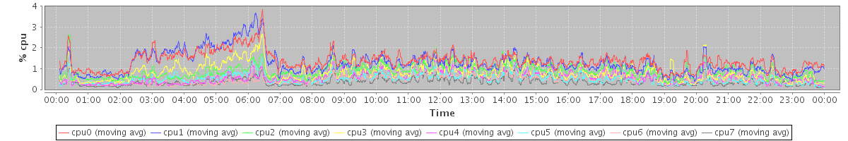 avg(cpu0) = 0.23 avg(cpu1) = 0.20 avg(cpu2) = 0.13 avg(cpu3) = 0.16 avg(cpu4) = 0.09 avg(cpu5) = 0.06 avg(cpu6) = 0.04 avg(cpu7) = 0.03