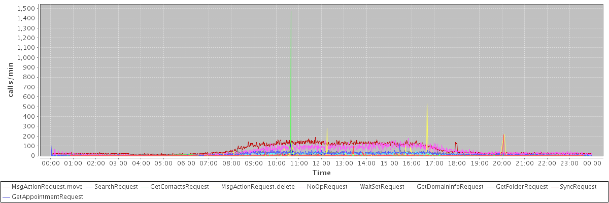 max(MsgActionRequest.move) = 216.00 max(SearchRequest) = 119.00 max(GetContactsRequest) = 1470.00 max(MsgActionRequest.delete) = 530.00 max(NoOpRequest) = 179.00 max(WaitSetRequest) = 56.00 max(GetDomainInfoRequest) = 68.00 max(GetFolderRequest) = 75.00 max(SyncRequest) = 189.00 max(GetAppointmentRequest) = 151.00