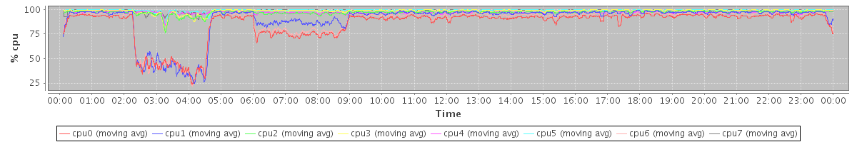 avg(cpu0) = 85.33 avg(cpu1) = 89.70 avg(cpu2) = 96.91 avg(cpu3) = 98.52 avg(cpu4) = 96.96 avg(cpu5) = 99.29 avg(cpu6) = 87.62 avg(cpu7) = 99.02