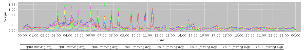 avg(cpu0) = 1.14 avg(cpu1) = 1.08 avg(cpu2) = 0.86 avg(cpu3) = 0.84 avg(cpu4) = 0.66 avg(cpu5) = 0.51 avg(cpu6) = 0.41 avg(cpu7) = 0.32