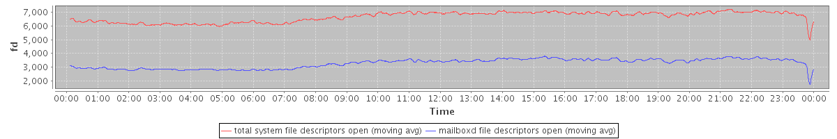 avg(total system file descriptors open) = 6675.87 avg(mailboxd file descriptors open) = 3265.54