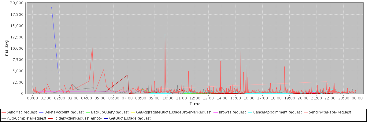 avg(SendMsgRequest) = 560.21 avg(DeleteAccountRequest) = 11861.00 avg(BackupQueryRequest) = 259.80 avg(GetAggregateQuotaUsageOnServerRequest) = 3446.00 avg(BrowseRequest) = 365.80 avg(CancelAppointmentRequest) = 220.00 avg(SendInviteReplyRequest) = 1086.80 avg(AutoCompleteRequest) = 257.11 avg(FolderActionRequest.empty) = 440.00 avg(GetQuotaUsageRequest) = 4312.00