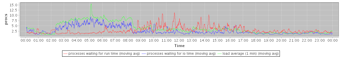 avg(processes waiting for run time) = 2.42 avg(processes waiting for io time) = 2.09 avg(load average (1 min)) = 3.93