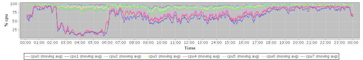 avg(cpu0) = 1.36 avg(cpu1) = 1.31 avg(cpu2) = 1.02 avg(cpu3) = 0.85 avg(cpu4) = 1.00 avg(cpu5) = 0.62 avg(cpu6) = 0.51 avg(cpu7) = 0.42