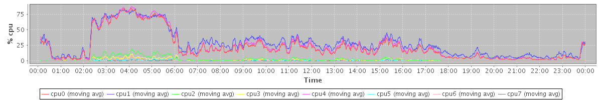 avg(cpu0) = 22.61 avg(cpu1) = 27.80 avg(cpu2) = 2.53 avg(cpu3) = 1.51 avg(cpu4) = 24.02 avg(cpu5) = 0.68 avg(cpu6) = 0.74 avg(cpu7) = 0.41