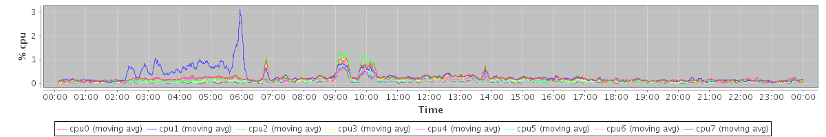 avg(cpu0) = 0.21 avg(cpu1) = 0.29 avg(cpu2) = 0.18 avg(cpu3) = 0.15 avg(cpu4) = 0.13 avg(cpu5) = 0.09 avg(cpu6) = 0.07 avg(cpu7) = 0.05