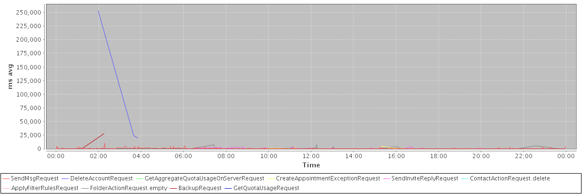 avg(SendMsgRequest) = 510.83 avg(DeleteAccountRequest) = 98930.00 avg(GetAggregateQuotaUsageOnServerRequest) = 3336.00 avg(CreateAppointmentExceptionRequest) = 512.35 avg(SendInviteReplyRequest) = 627.03 avg(ContactActionRequest.delete) = 387.50 avg(ApplyFilterRulesRequest) = 2980.00 avg(FolderActionRequest.empty) = 1011.16 avg(BackupRequest) = 14840.00 avg(GetQuotaUsageRequest) = 4642.00