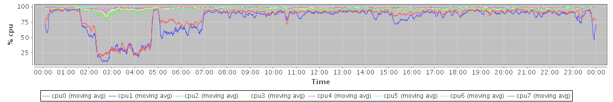 avg(cpu0) = 11.63 avg(cpu1) = 15.40 avg(cpu2) = 0.63 avg(cpu3) = 0.36 avg(cpu4) = 0.15 avg(cpu5) = 0.18 avg(cpu6) = 0.04 avg(cpu7) = 0.11