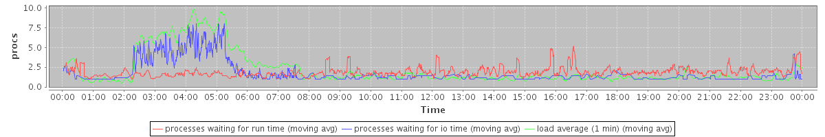avg(processes waiting for run time) = 1.22 avg(processes waiting for io time) = 1.01 avg(load average (1 min)) = 2.19