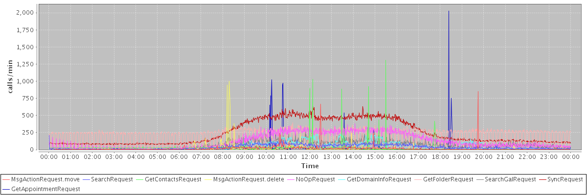 max(MsgActionRequest.move) = 851.00 max(SearchRequest) = 210.00 max(GetContactsRequest) = 1306.00 max(MsgActionRequest.delete) = 998.00 max(NoOpRequest) = 383.00 max(GetDomainInfoRequest) = 226.00 max(GetFolderRequest) = 395.00 max(SearchGalRequest) = 302.00 max(SyncRequest) = 634.00 max(GetAppointmentRequest) = 2027.00