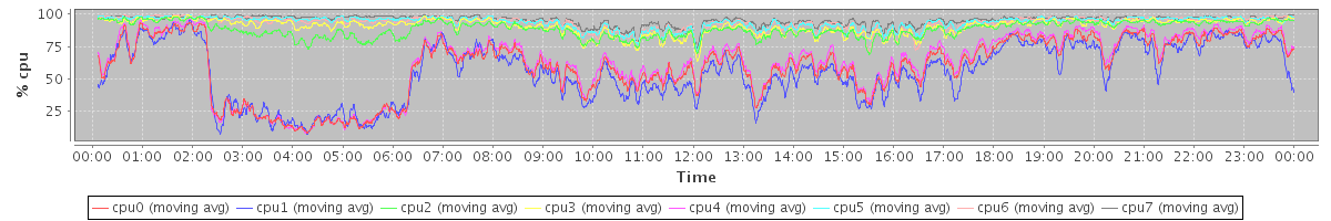 avg(cpu0) = 1.28 avg(cpu1) = 1.18 avg(cpu2) = 0.88 avg(cpu3) = 0.75 avg(cpu4) = 1.02 avg(cpu5) = 0.52 avg(cpu6) = 0.48 avg(cpu7) = 0.36