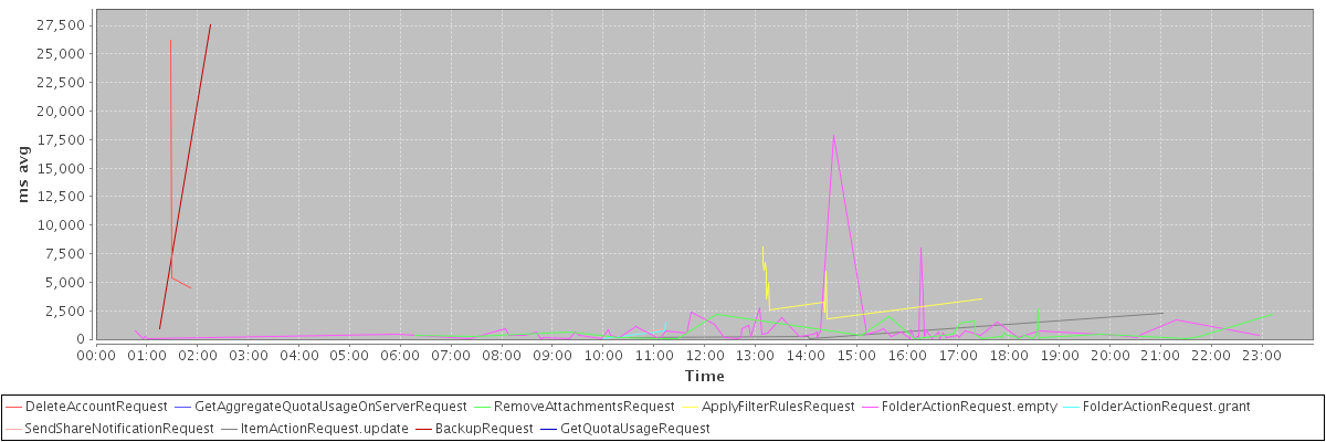 avg(DeleteAccountRequest) = 11984.67 avg(GetAggregateQuotaUsageOnServerRequest) = 2103.00 avg(RemoveAttachmentsRequest) = 557.40 avg(ApplyFilterRulesRequest) = 4501.80 avg(FolderActionRequest.empty) = 870.71 avg(FolderActionRequest.grant) = 775.67 avg(SendShareNotificationRequest) = 645.00 avg(ItemActionRequest.update) = 686.50 avg(BackupRequest) = 14267.50 avg(GetQuotaUsageRequest) = 3144.00